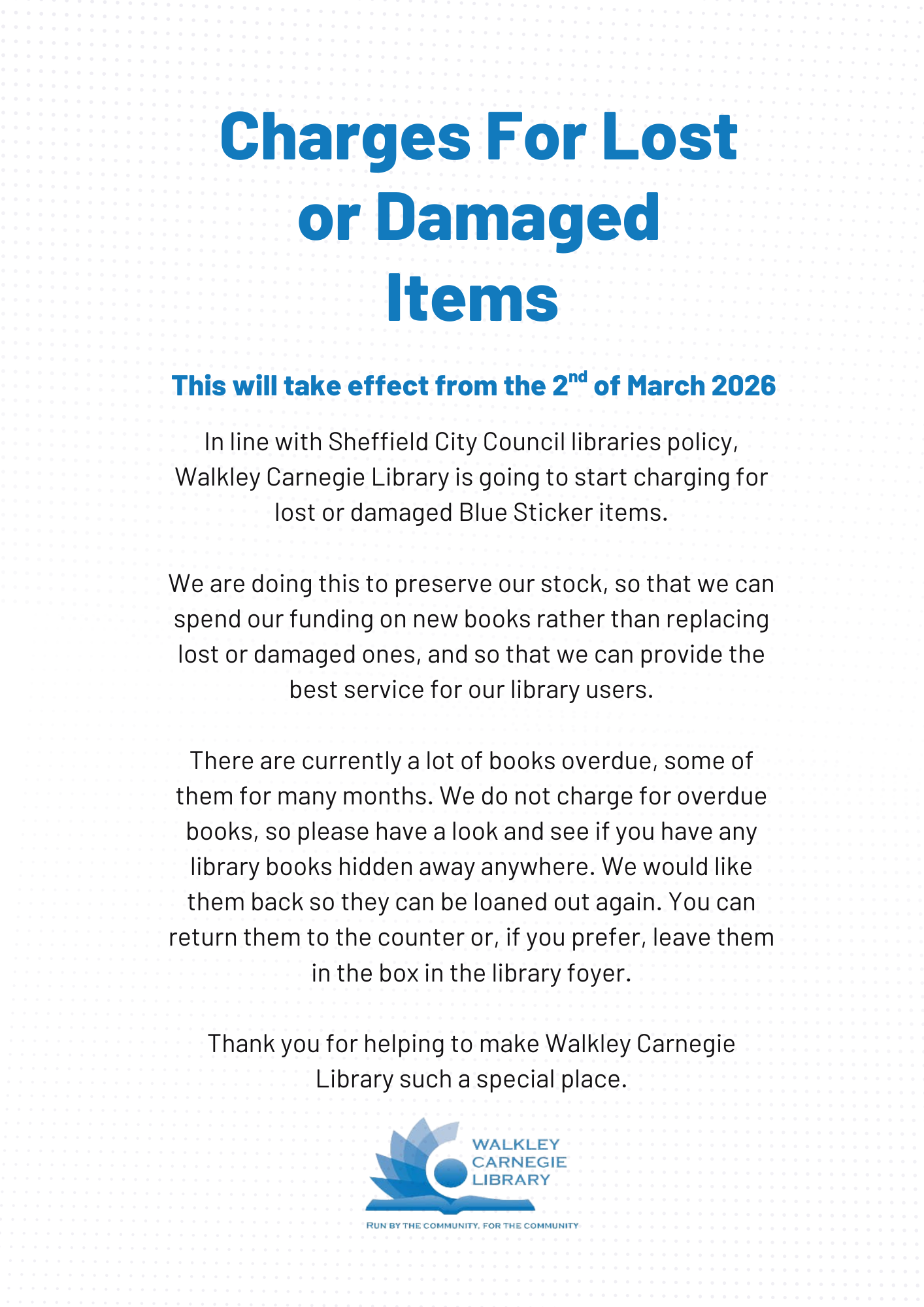 We are also looking for more Trustees. Please email trustees@walkleylibrary.org.uk for more information.