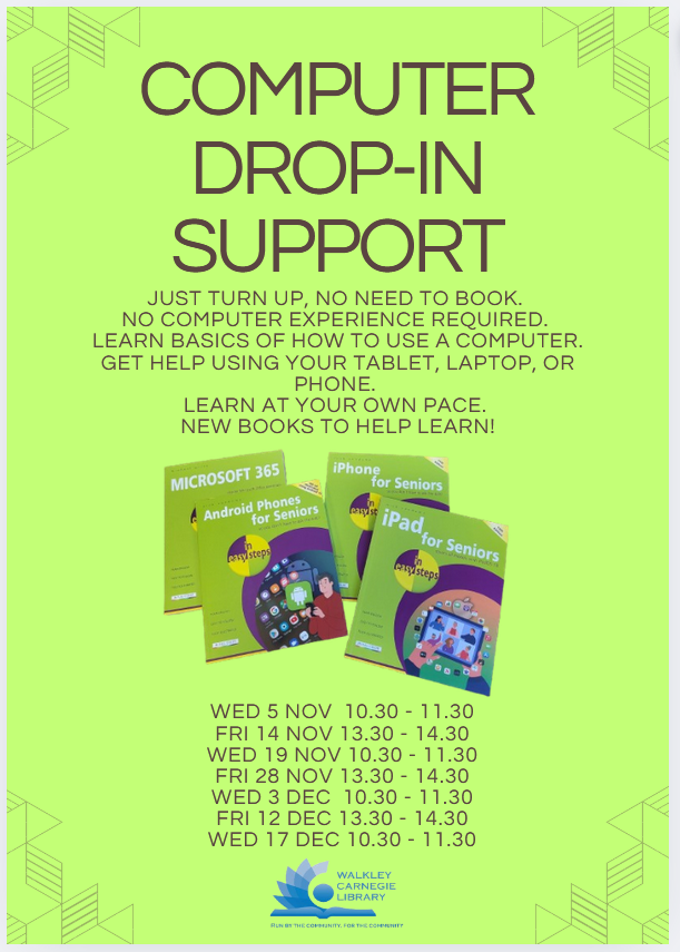 We’re once again holding drop-in sessions for computer help at Walkley Library. This covers help with using your tablet, laptop or phone. Just turn up at any of the dates and times shown below, there is no need to book.
