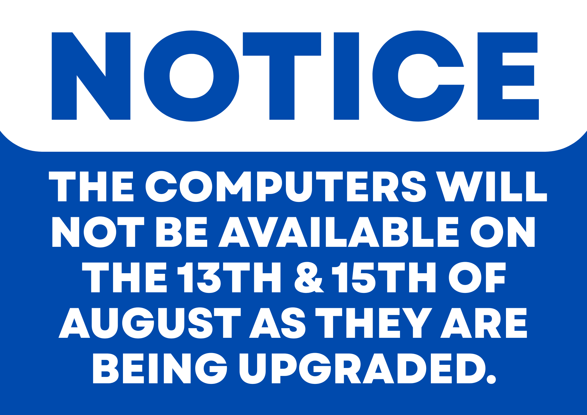We’re upgrading the library computers on 13th & 15th August, so they won’t be available to use on these days.